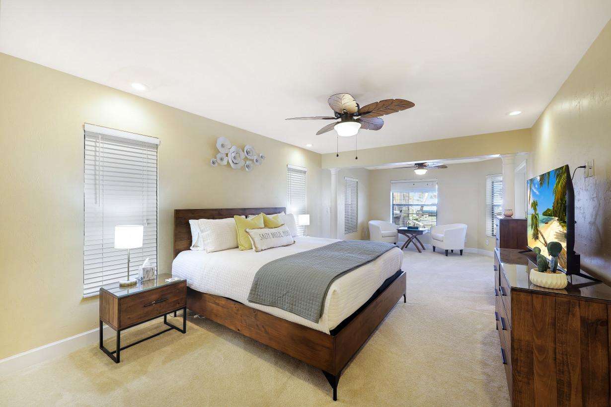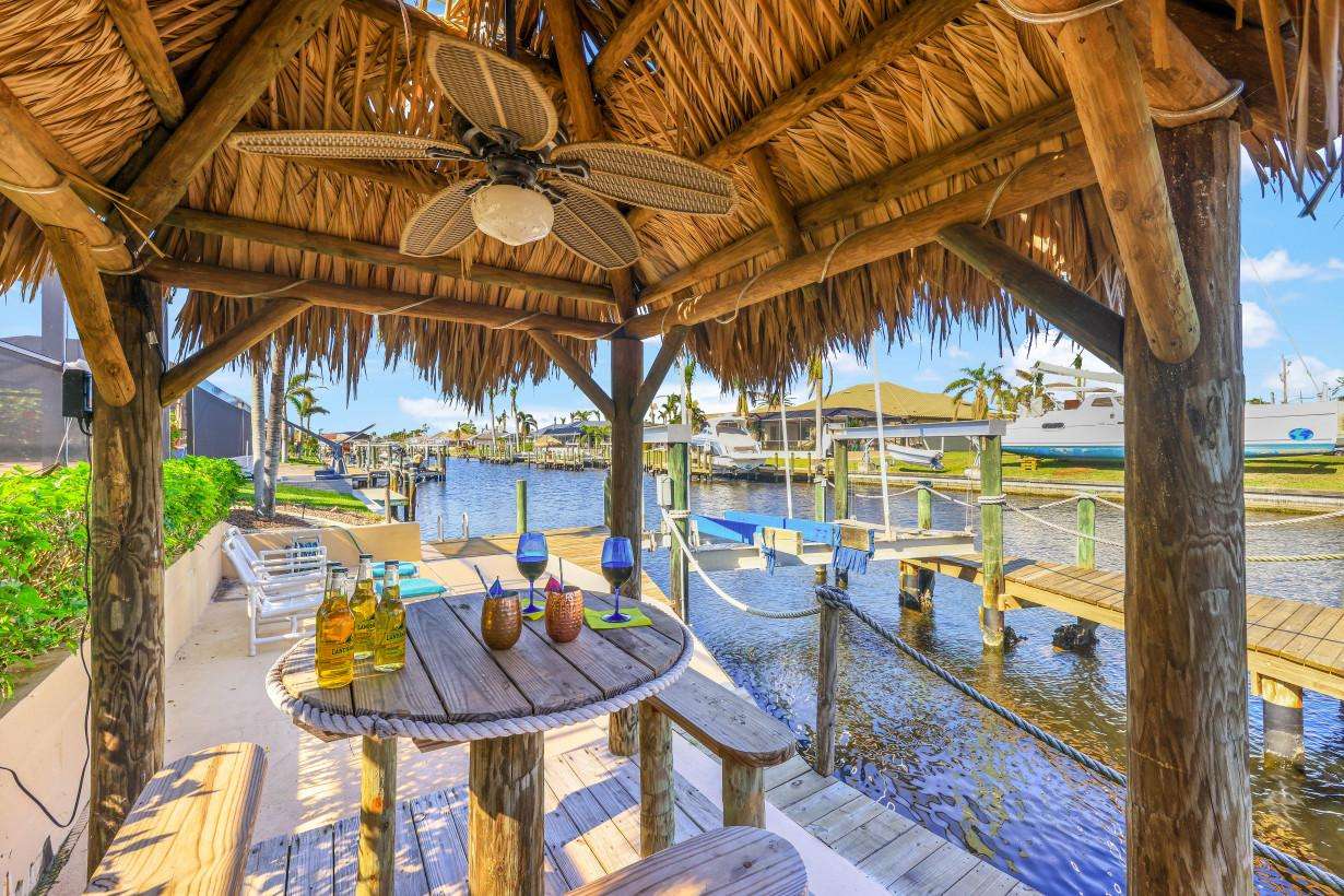 Stepping outside to the screened lanai, guests can enjoy the private deck area with an Outdoor Kitchen/Bar area with TV. There is outdoor high top seating for 6 so guests + an additional TV so guests can enjoy alfresco dining and entertainment. Stepping down to the private dock area, guests can spend some quiet time under the shade of the Tiki Hut down by water's edge. A perfect spot for morning coffee or an evening cocktail.