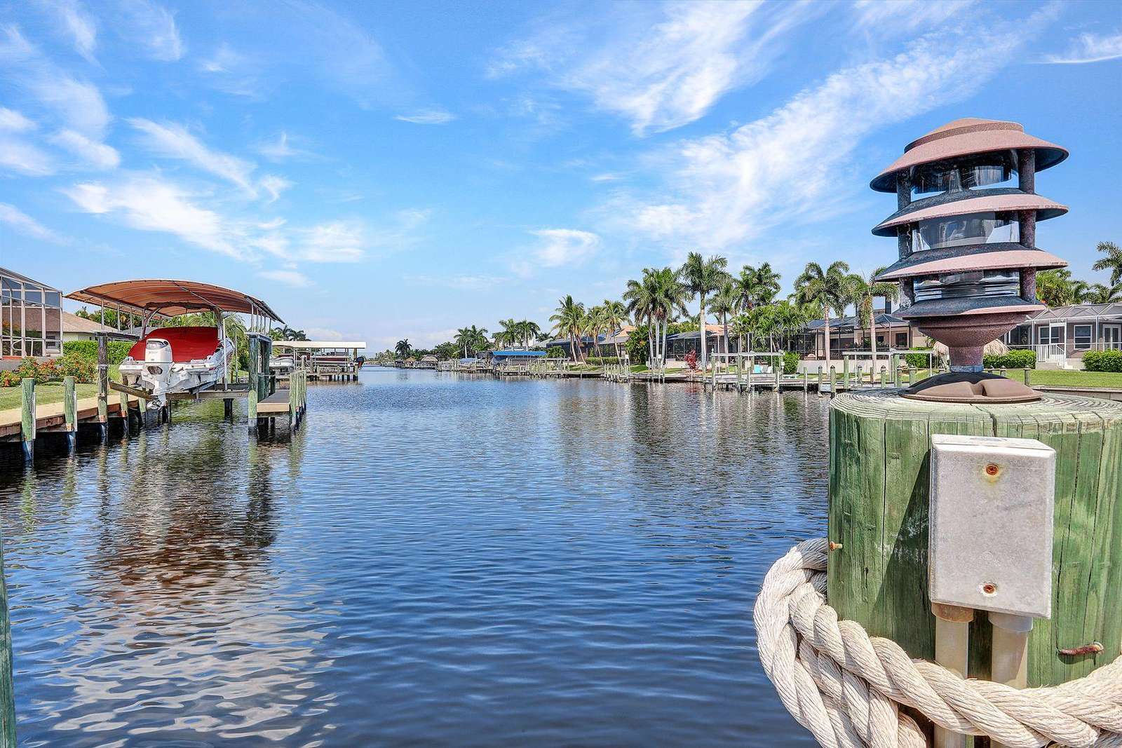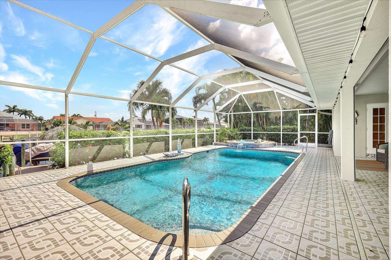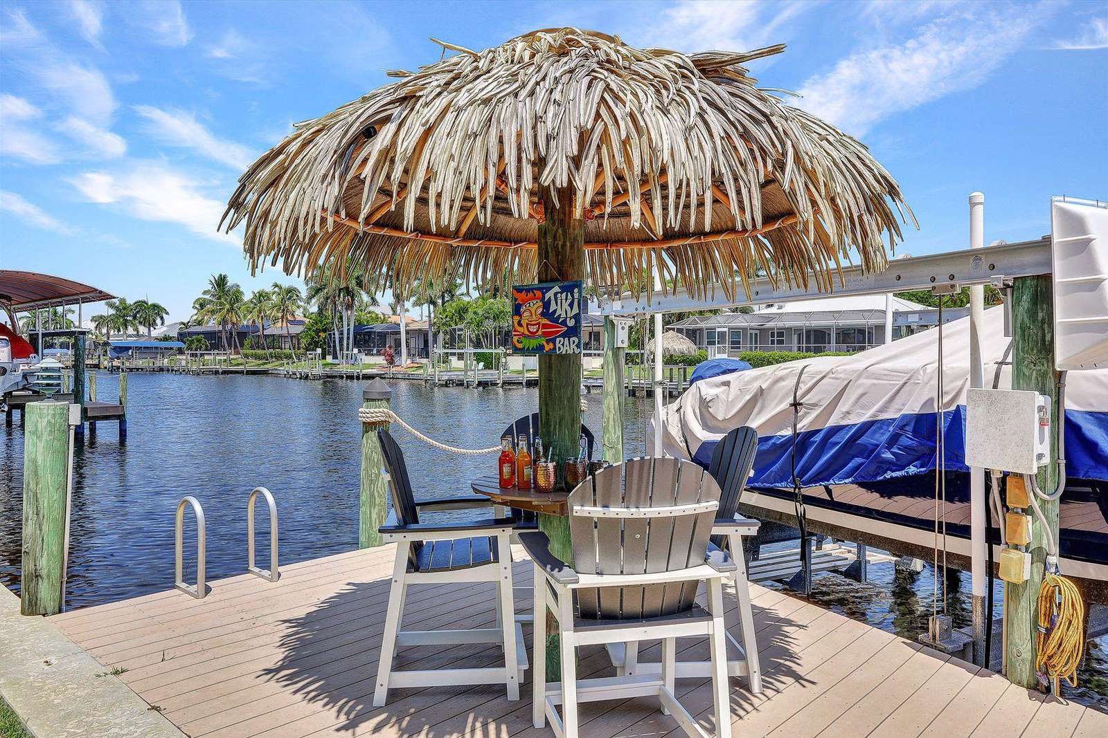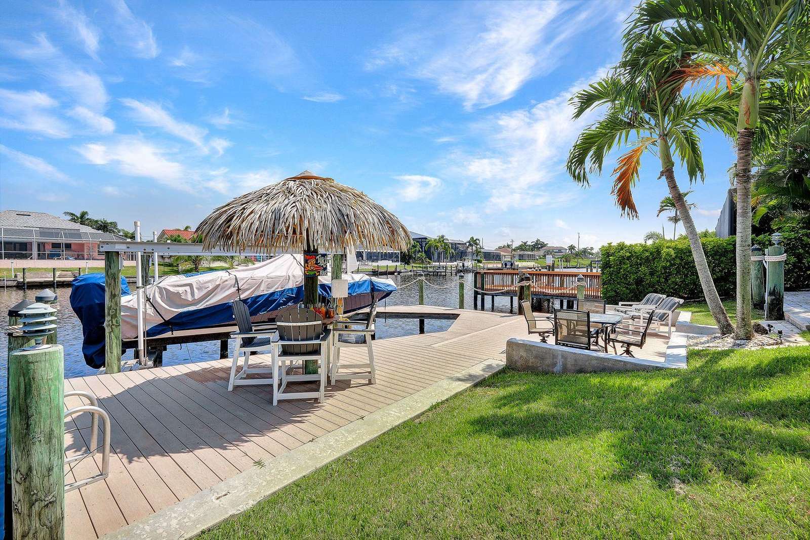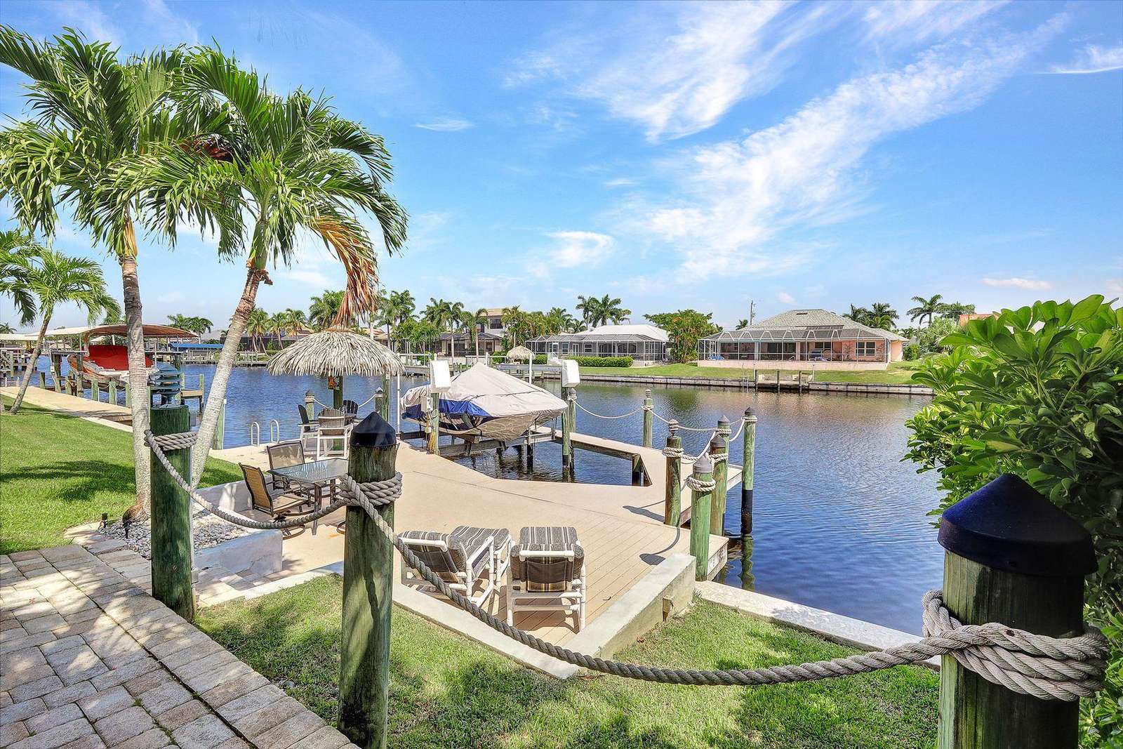 Upscale location close to Cape Harbor Marina. Gorgeous oversized pool deck with spa plus private dock with Tiki Hut on wide Gulf access canal