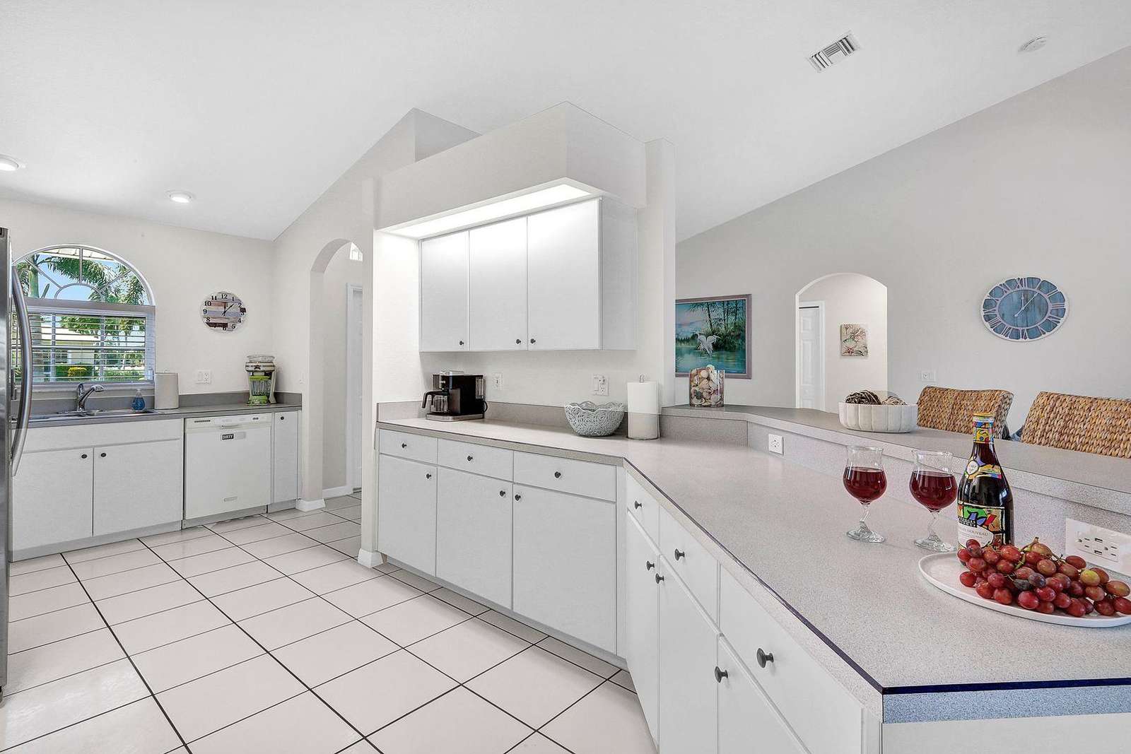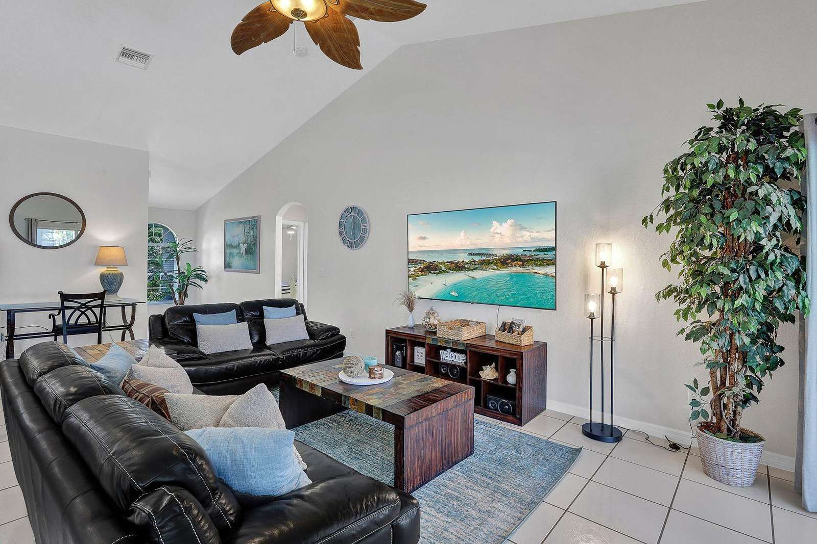 On stepping through the home's entrance you will be greeted with the very popular Great Room layout where living, dining and the kitchen are combined to make one spacious main living area. The Living area is furnished with comfortable leather sofas, Smart TV, desk and chair for remote working plus views over the pretty pool area. The Kitchen is spacious and has everything a guest would need. The Master suite is spacious and upscale in its' appointments. It comes furnished with a sumptuous King size bed, Smart TV and sliding doors to the pool area. The adjacent Master Bathroom completes the Master area of the home. The Master Bath has a separate walk in shower and his and her basin area.