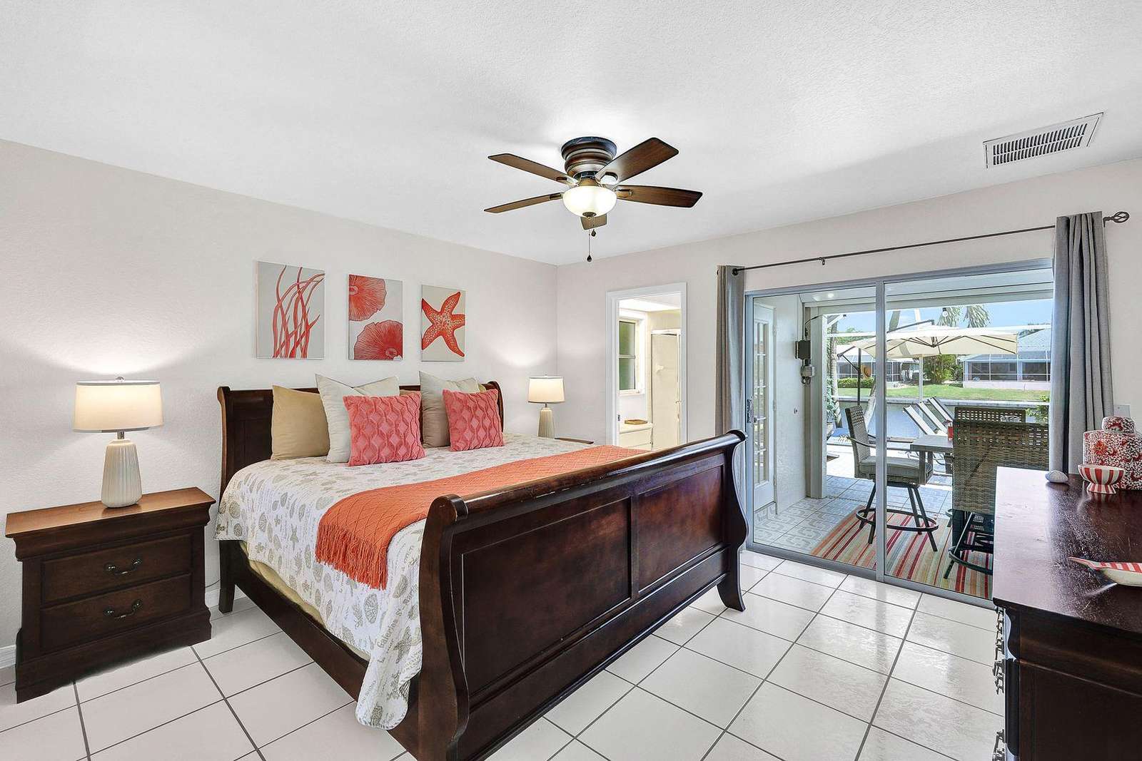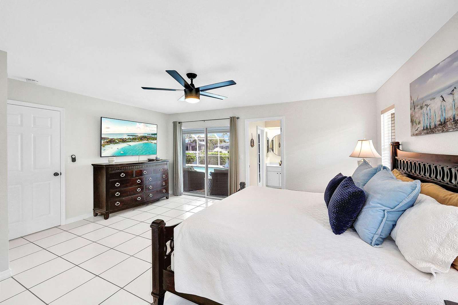 On stepping out through the sliding glass doors, the very private pool/spa deck area is over-sized with plenty of space for lounging in the sunshine, alfresco dining or sitting quietly at the Outdoor Living Area, reading a good book! The pool deck is also equipped with a large gas barbecue and Smart TV. Beyond the screened pool deck area there is a private dock area with Tiki Hut. A great place to engage in a bit of fishing in the canal just like the locals do or enjoy a cold cocktail and watch the sun go down.