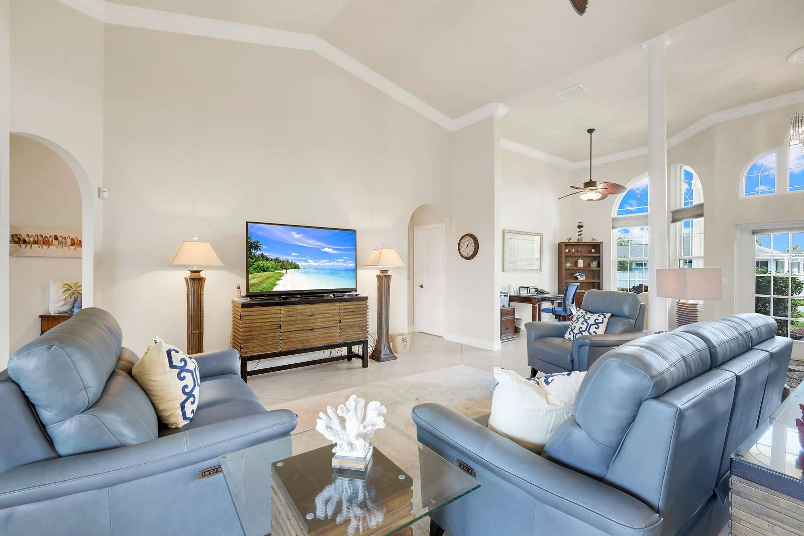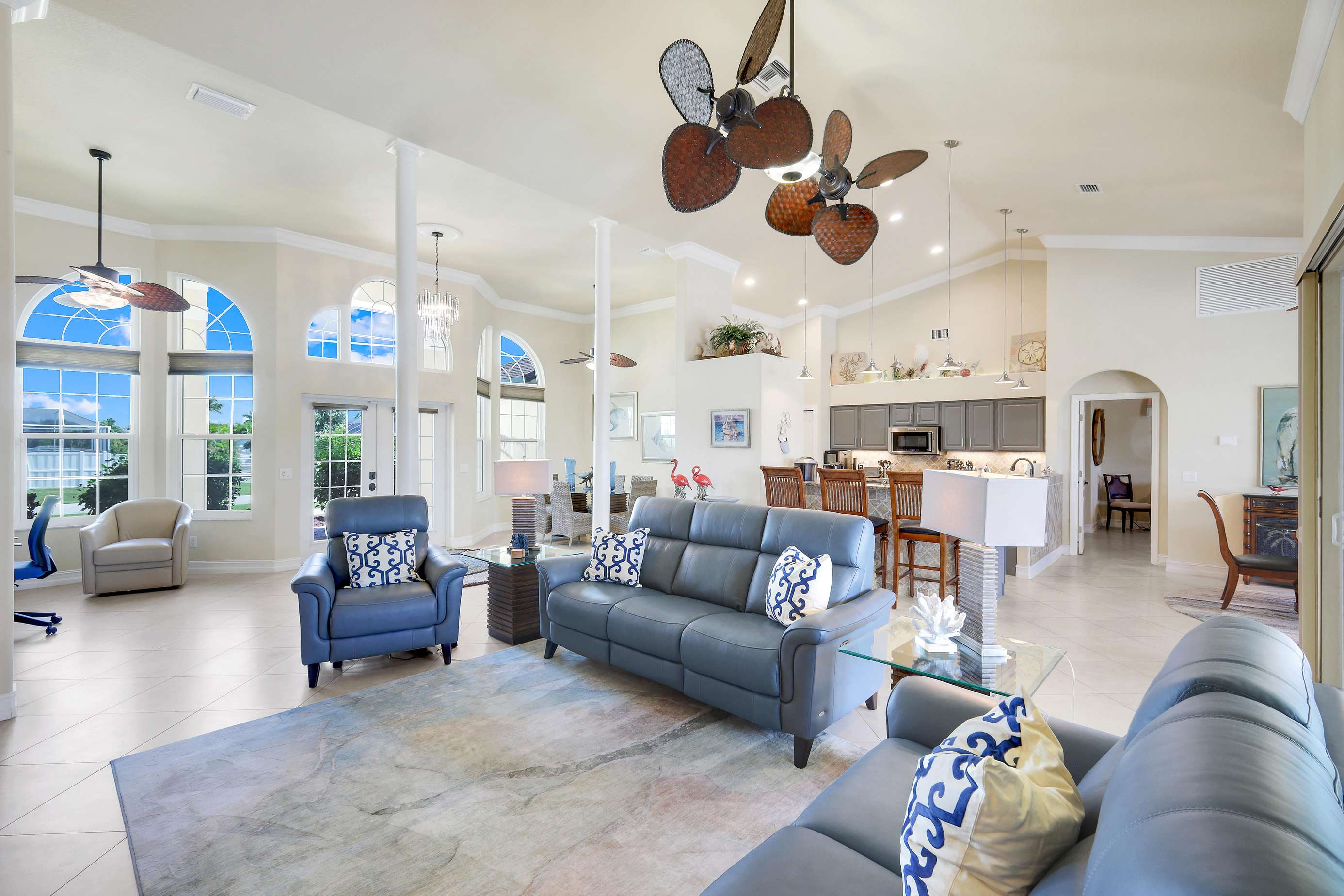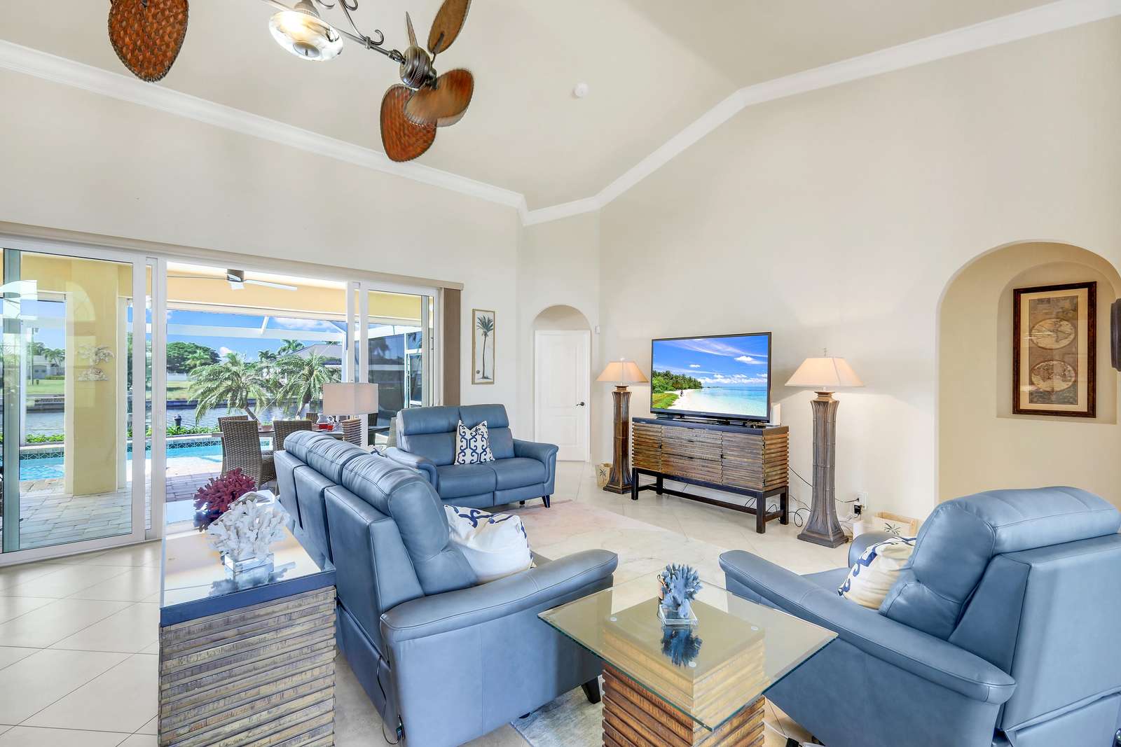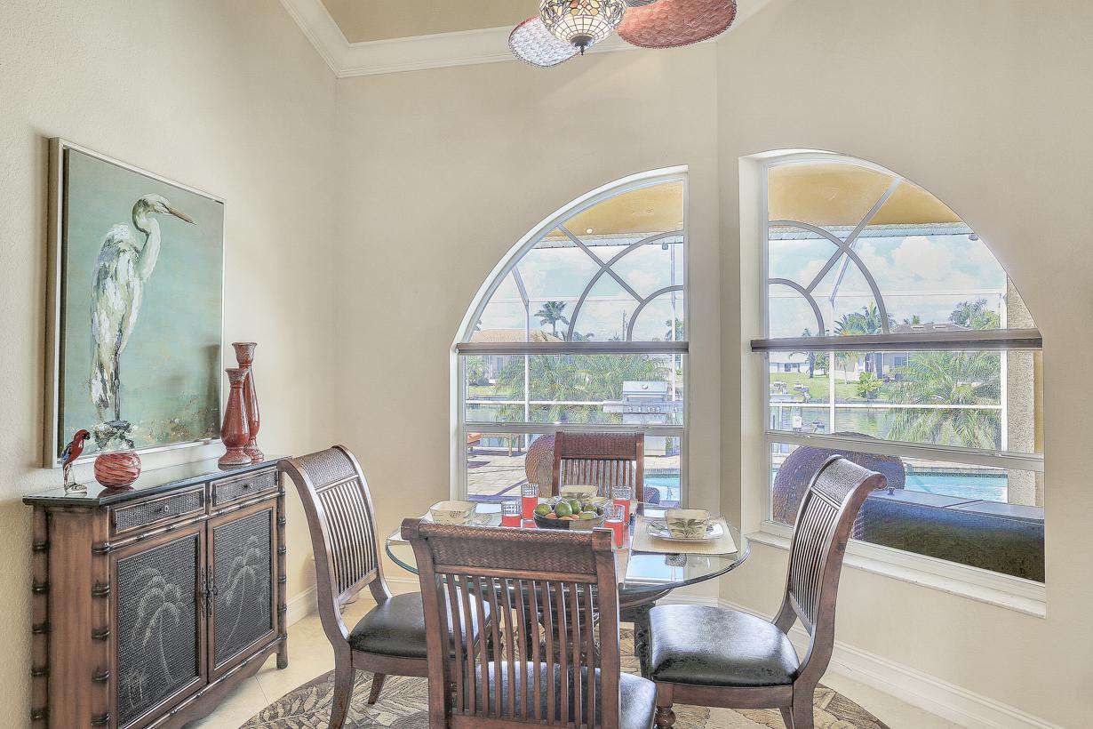 Villa Valinda is a direct gulf access waterfront pool home located on the upscale Spreader Waterway in SW Cape Coral. The home has been furnished to the very highest of standards to ensure the most comfortable of stays. The home features 3 well appointed bedrooms and 2 bathrooms (1 Master suite, 1 Guest Bathroom). The floor plan is the very popular open living concept where Living, Dining and Kitchen are combined to make one huge space. On stepping through the front entrance, guests will instantly appreciate the light and spacious layout. The main living area has been comfortably furnished with soft leather sofas and a 60" cable TV for family enjoyment.